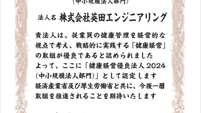 お知らせ2025年12月15日2026年度年間カレンダーのお知らせ弊社2026年度の営業日が決まりましたのでお知らせいたします。 なお、特別休暇や変更がある場合は別途ご案内いたします。 お知らせ2024年12月17日2025年度年間カレンダーのお知らせ弊社2025年度の営業日が決まりましたのでお知らせいたします。 なお、特別休暇や変更がある場合は別途ご案内いたします。 お知らせ2024年03月26日健康経営優良法人2024に認定されました経済産業省と日本健康会議が選定する「健康経営優良法人2024(中小規模法人部門)」に認定されました。 昨年に引き続き、2度目の認定となります。 今後とも健康で楽しく働ける職場環境を目指し、引き続き健康経営に取り組んでまいります。 健康経営優良法人認定制度とは 地域の健康課題の解決に向けた取り組みや、日本健康会議が勧める健康増進の取り組みをもとに、優良な健康経営を実践している大企業や中小企業等の法人を表彰する制度です。 英田エンジニアリングの健康経営についてはこちら お知らせ2024年03月07日ホームページリニューアルのお知らせ日頃より株式会社英田エンジニアリングのホームページをご覧いただき、誠にありがとうございます。 本日、ホームページをリニューアルしましたので、お知らせ致します。 今回のリニューアルでは、ご利用される皆様にとって、より情報が探しやすいよう構成やデザインを全面的に刷新しました。 これからも、引き続きご利用の皆様のお役に立つ情報のご提供や、内容の充実に努めてまいります。 今後ともご愛顧賜りますようお願い申し上げます。 株式会社英田エンジニアリング