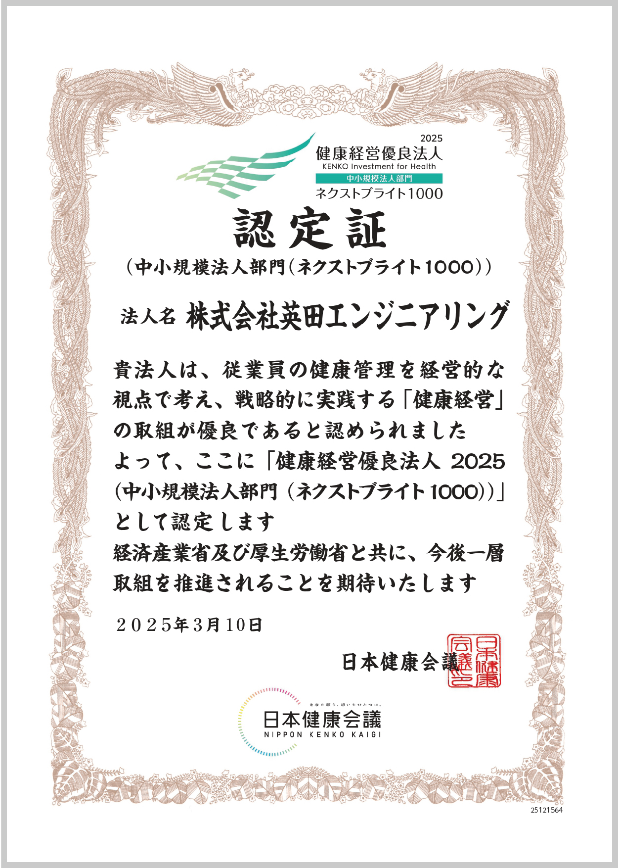 「健康経営優良法人ネクストブライト1000」は、2025年度から新設された健康経営優良法人認定制度における顕彰枠で、中小規模法人部門の上位501~1500位に認定されるものです。英田エンジニアリングは「健康経営優良法人ブライト500」認定に向けて、日々、全社一丸となって、健康経営の取り組みに精進してまいります。