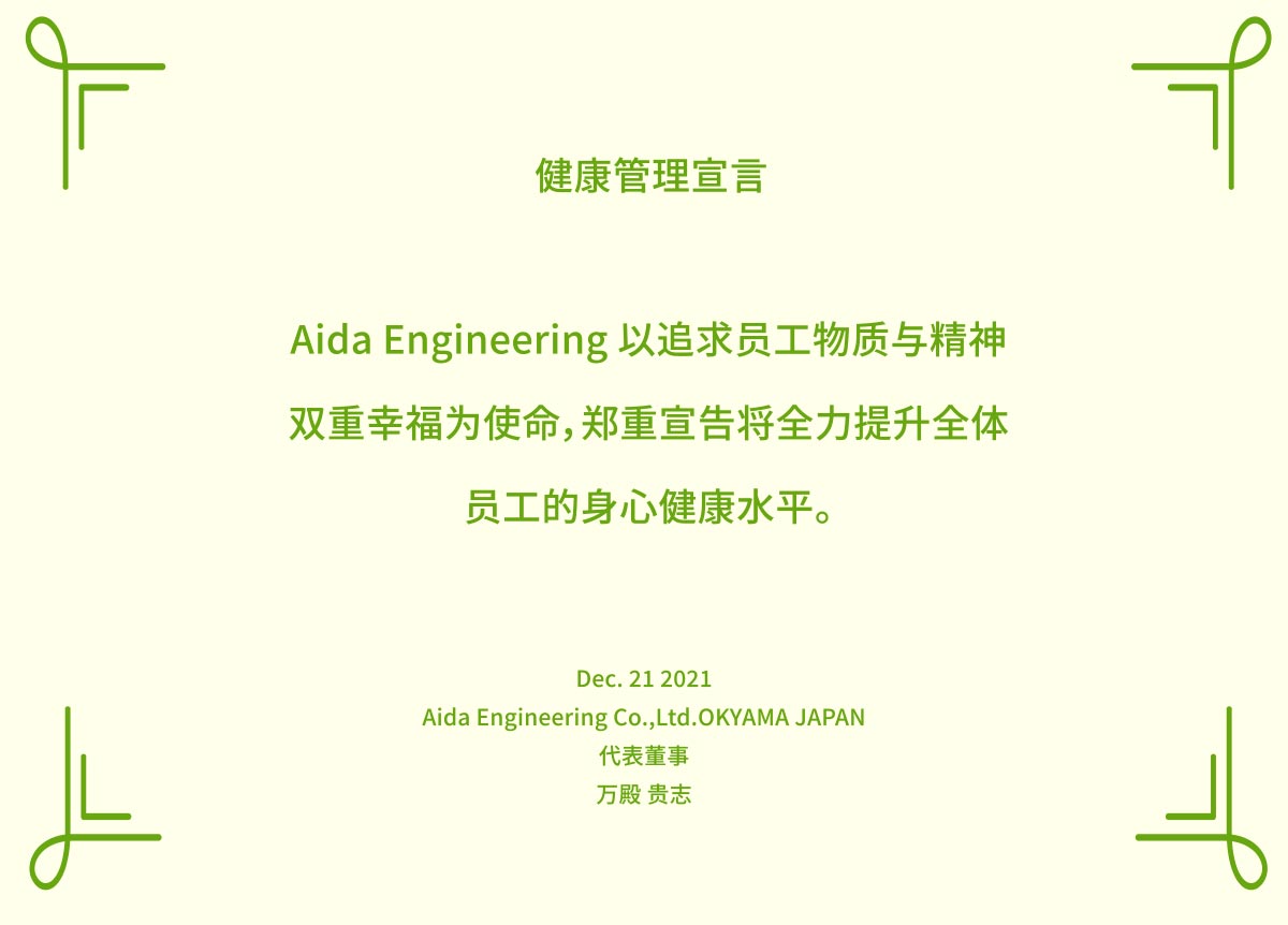 英田精密機械有限公司宣布大力推进健康管理。我们的目标是创造一个不让一个员工掉队的环境,让员工永远健康快乐地工作。我们将利用 2020 年竣工的 AIDINING AIDOJO 福利设施,促进食品、心理和身体健康。此外,我们还将创造更好的工作环境,加强工作与生活的平衡,并通过各种活动积极支持员工之间的互动。